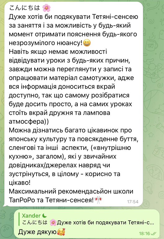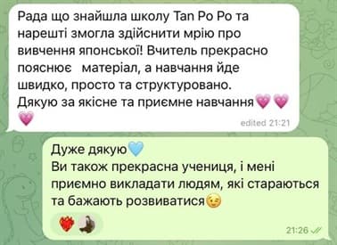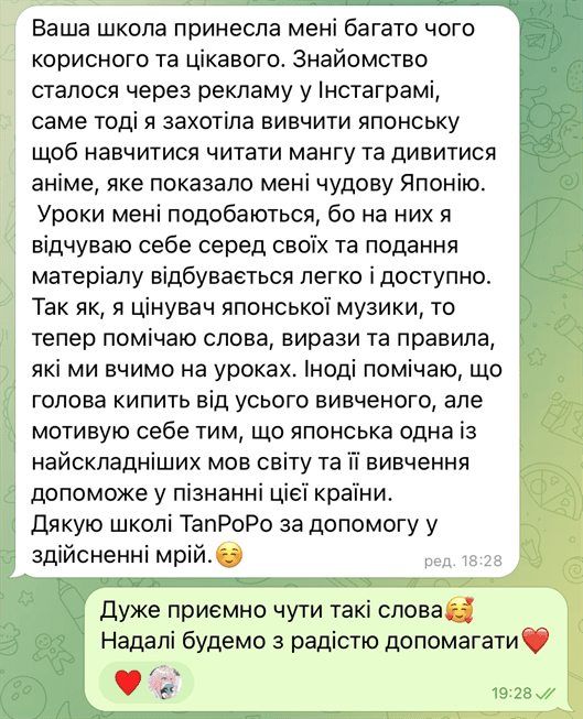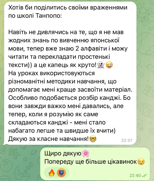🏆 Моє навчання в Японії було кроком до моєї наступної мрії - відкриття школи японської мови TanPoPo! Ця ідея зародилася майже відразу, ставши сенсеєм. За ці 7 років я навчала різних учнів: дітей, дорослих, іноземців та навіть самих японців. Всі учні дуже різні, але всі чудові! Кожен із них - моя гордість!
