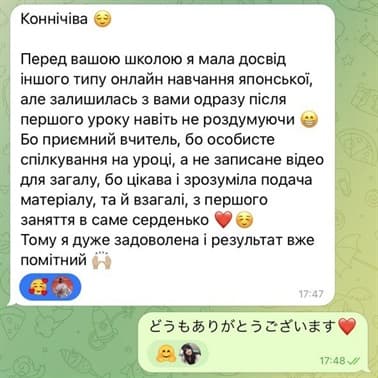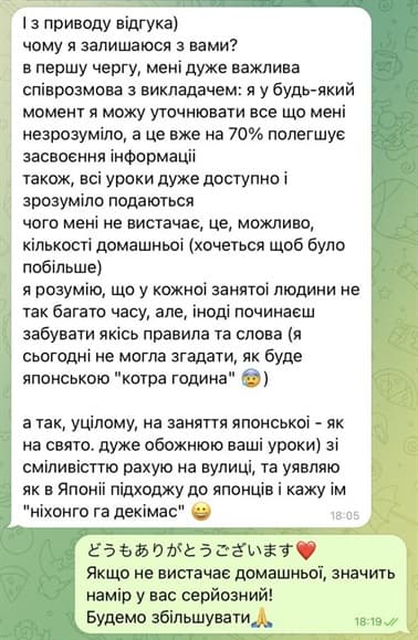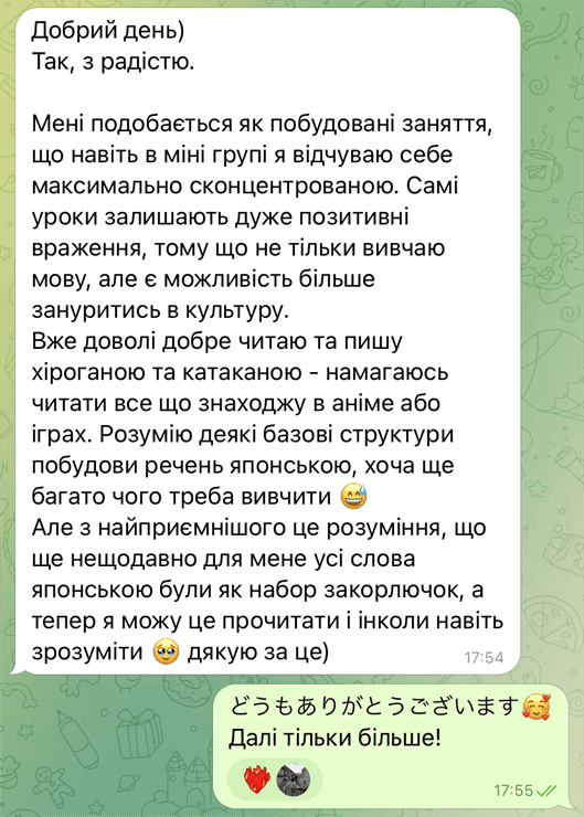 💛 Найбільшу цінність завжди вбачала у викладанні японської мови саме для українців. Велика ціль для мене полягає в популяризації японістики на теренах України, прагну надихнути українців вивчати японську мову та культуру. І таким чином, теж бажаю донести наше культурне багатство і до самих японців! Саме тому запрошую усіх у кого є бажання пізнавати та вивчати японську мову та культуру - долучатися!